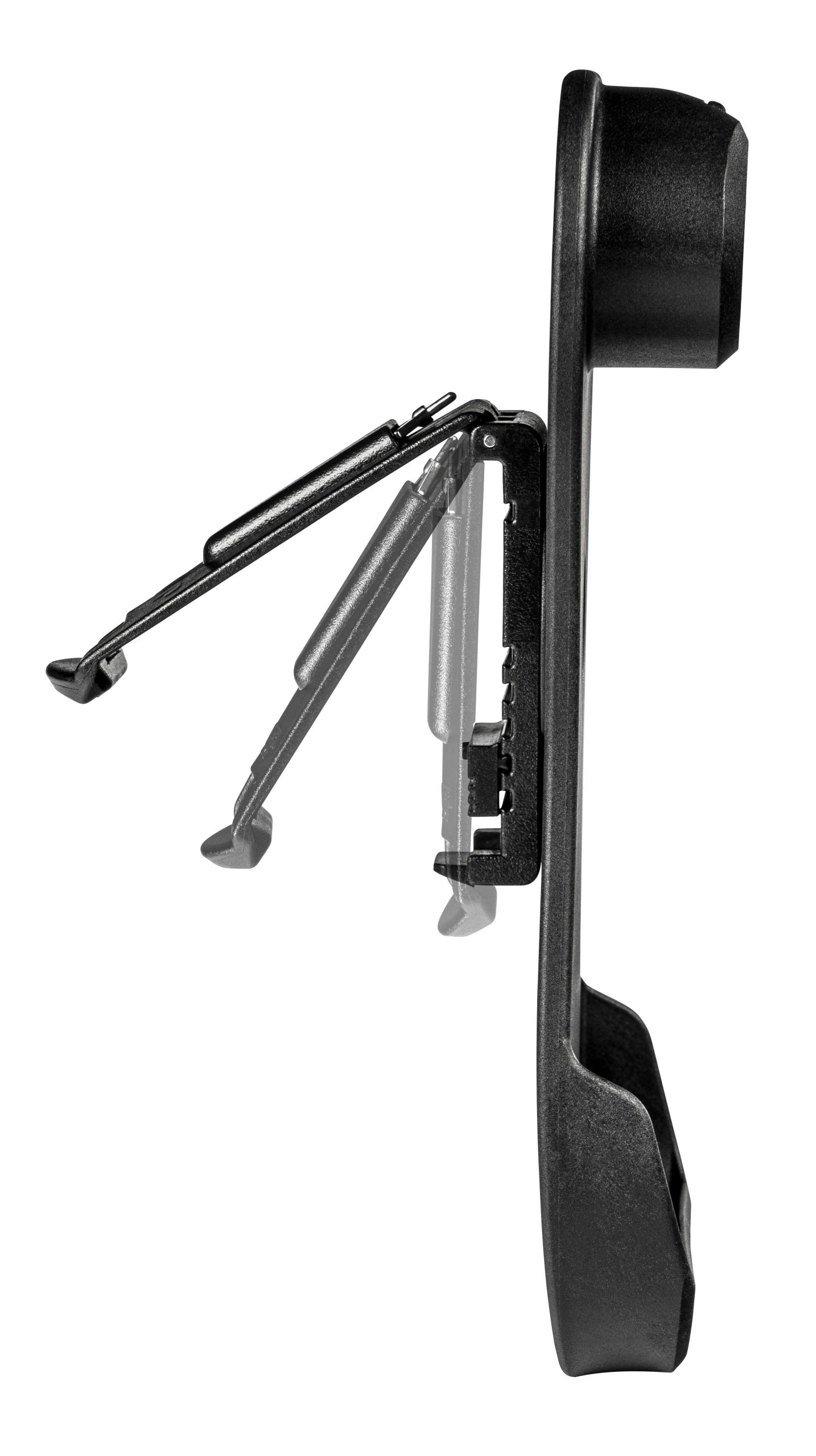 A Rigid Handcuff snaps into the case. It may be locked in place with the concealed lock on the back of the carrier. The cuff can be rapidly disengaged by pressing and sliding the release lock.