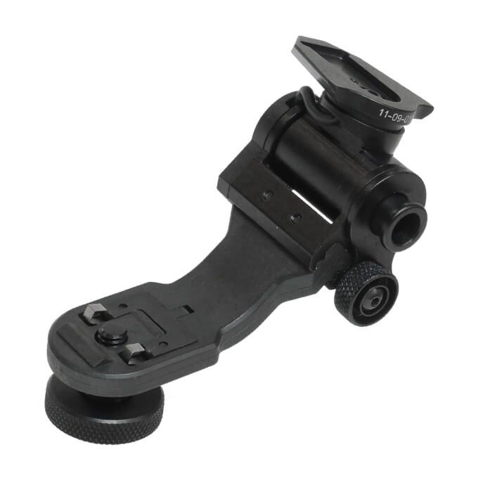The Wilcox AN/PVS-14 Arm with NVG Interface Shoe, provides a durable connection for mounting an AN/PVS–14 goggle to a Wilcox Combat Helmet Interface Mount. It can be easily mounted and dismounted from the AN/PVS-14 goggle by means of a thumb screw, and allows the operator to select the height and angle for comfort with the ability to make fine adjustments to the Arm to customize the position of the Night Vision Goggle for proper eye position and relief.